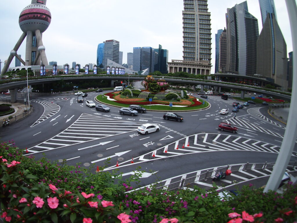 パール・リング(明珠環)と呼ばれる円形の歩行者デッキがあって、その中心は車のラウンドアバウト(回転式交差点)になっている